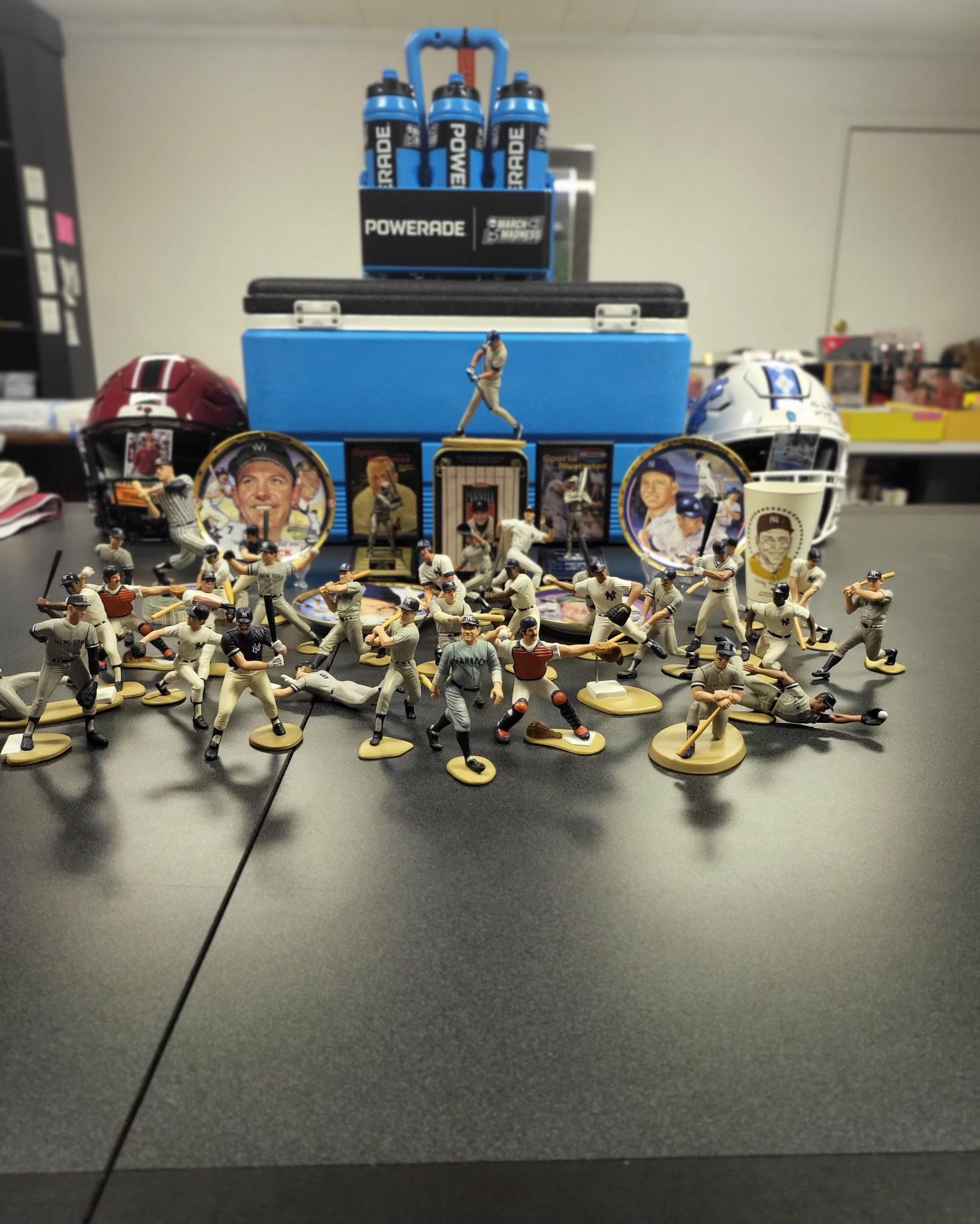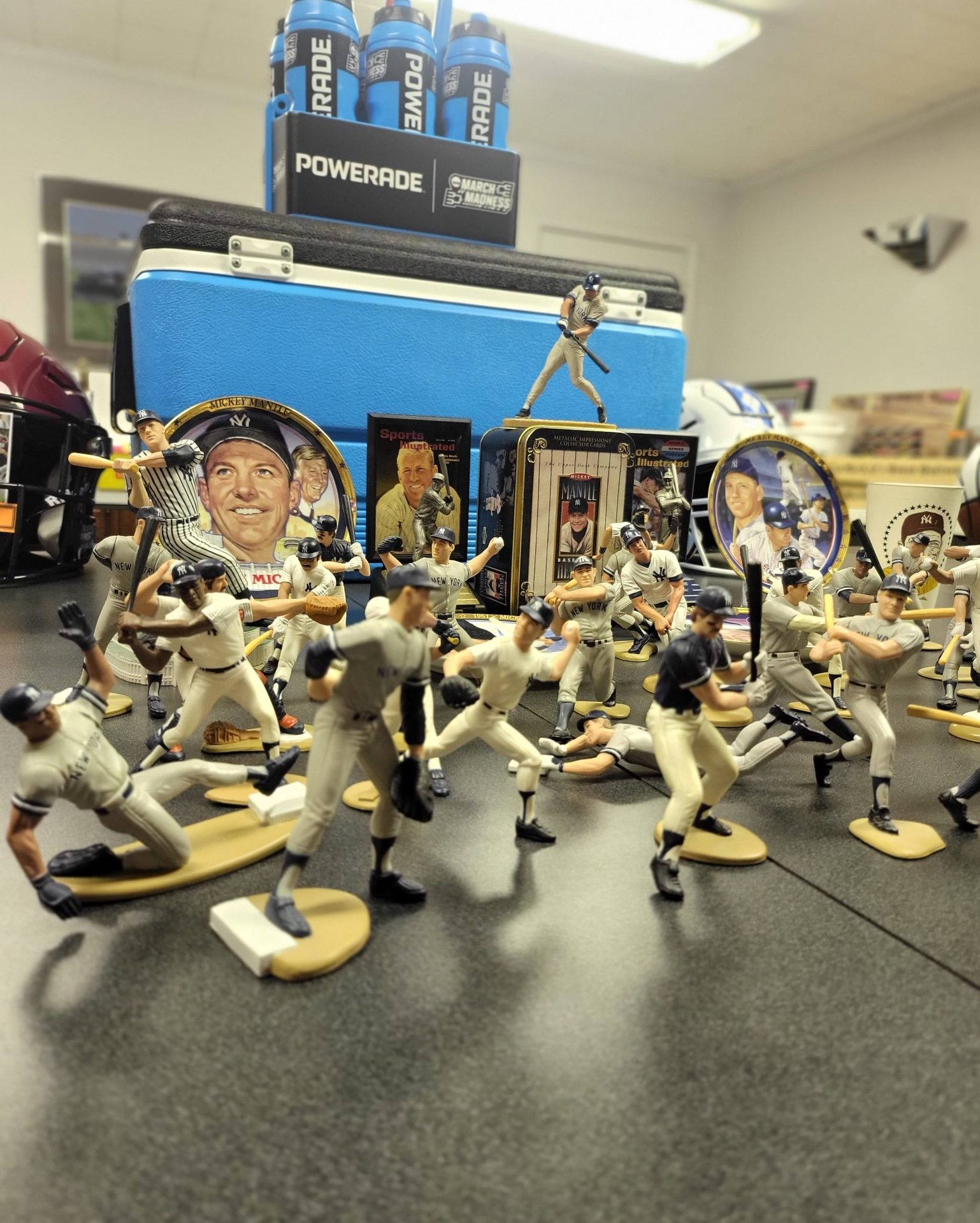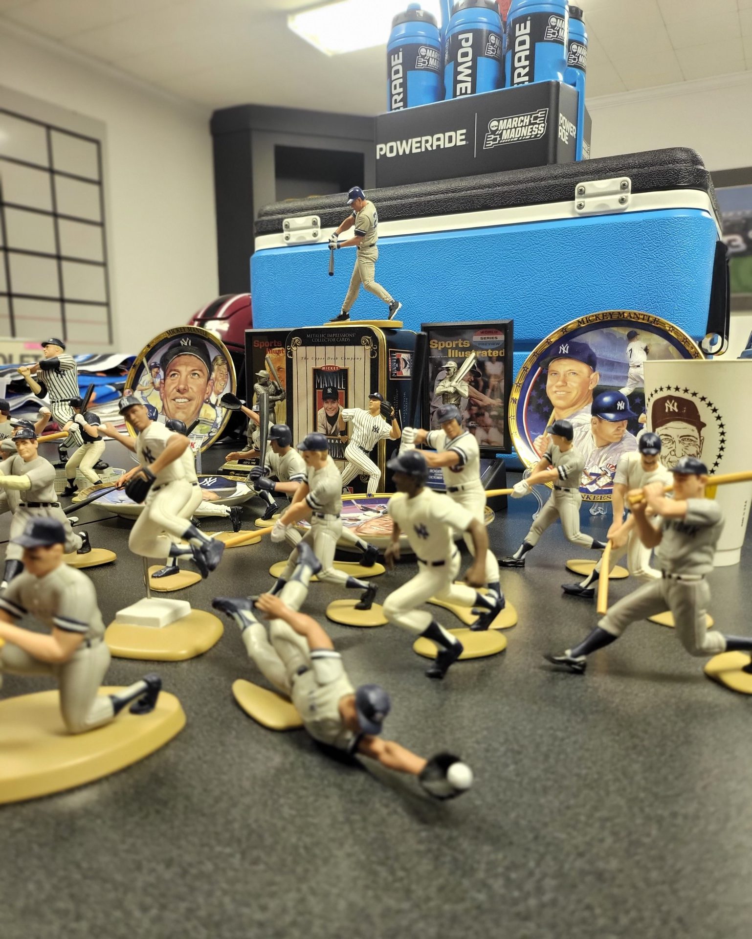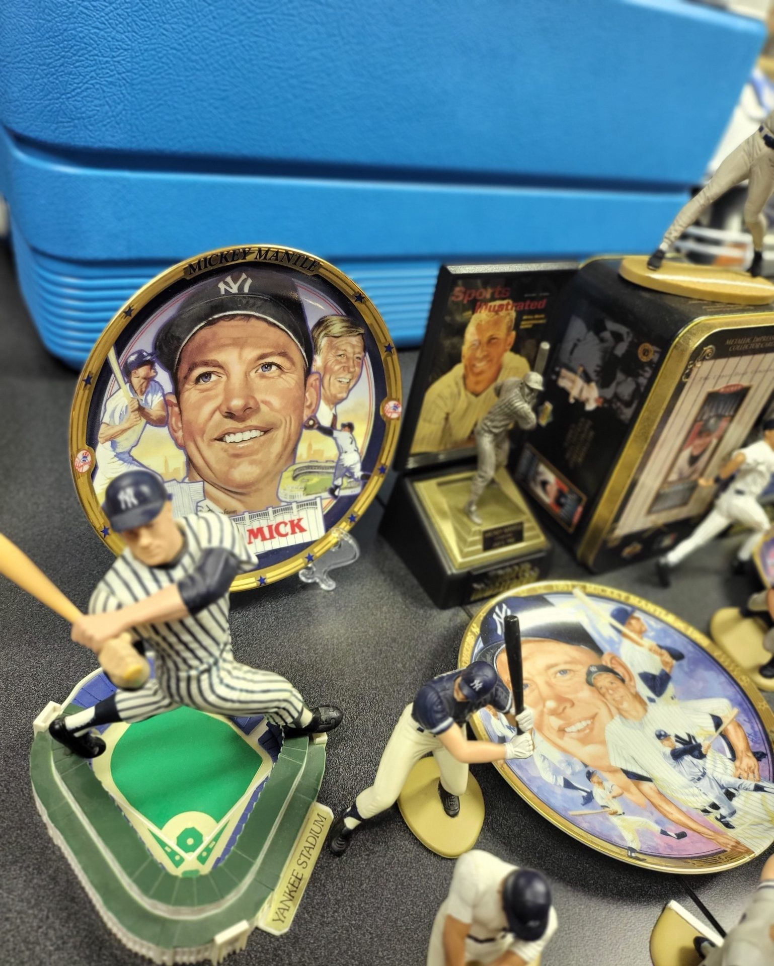 Mickey Mantle collectors plates, metal card, figurines- plus New York Yankees starting lineup figures.
