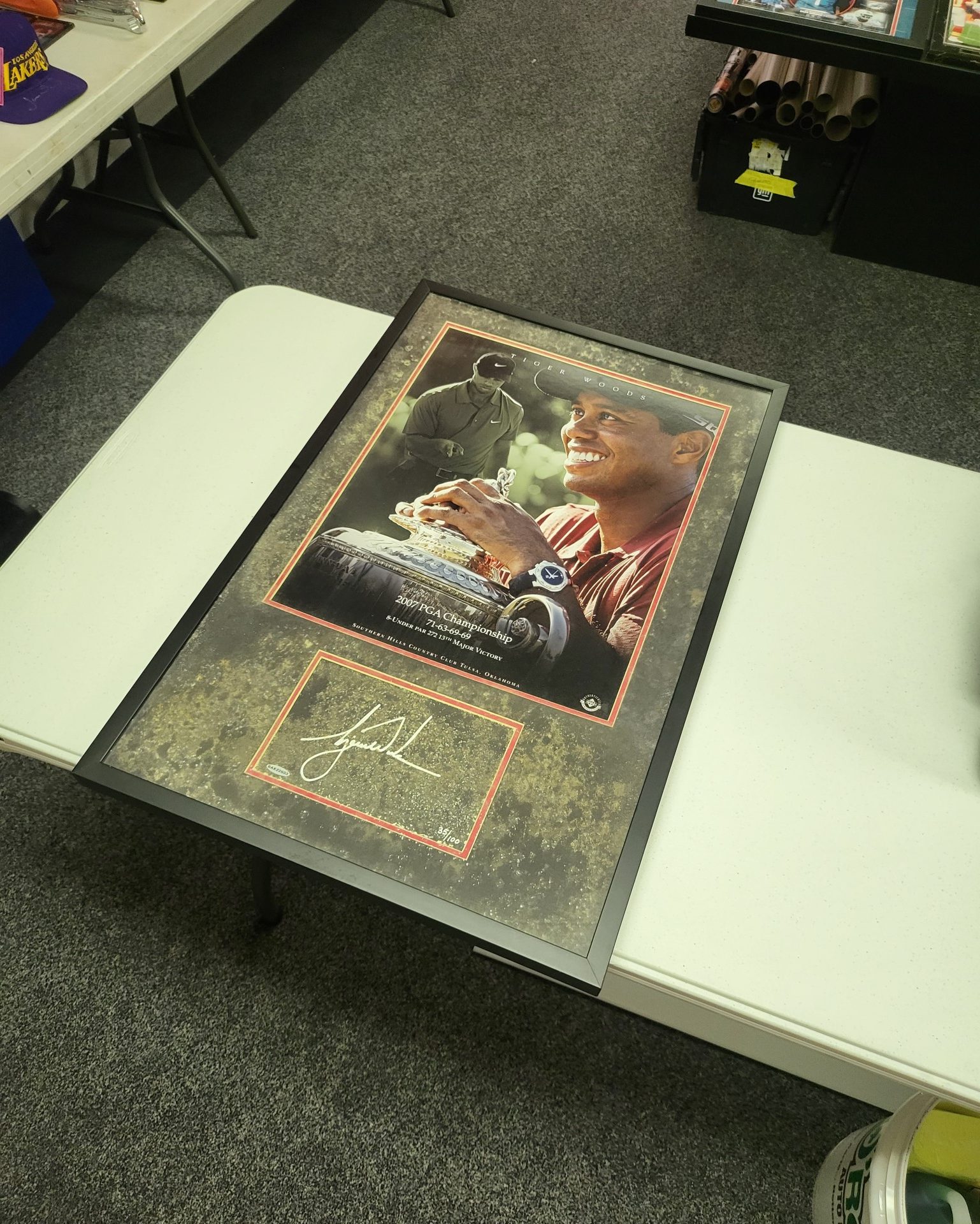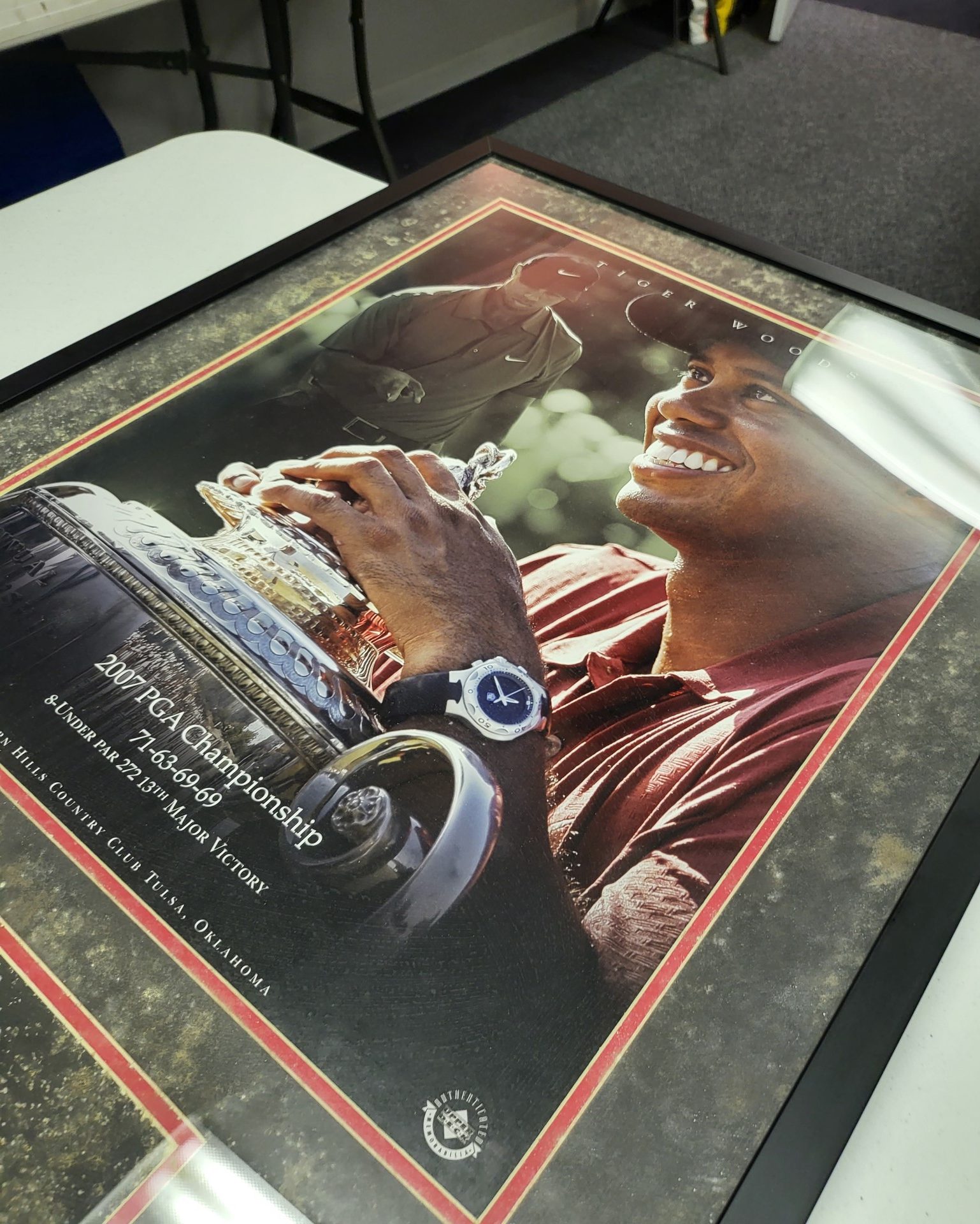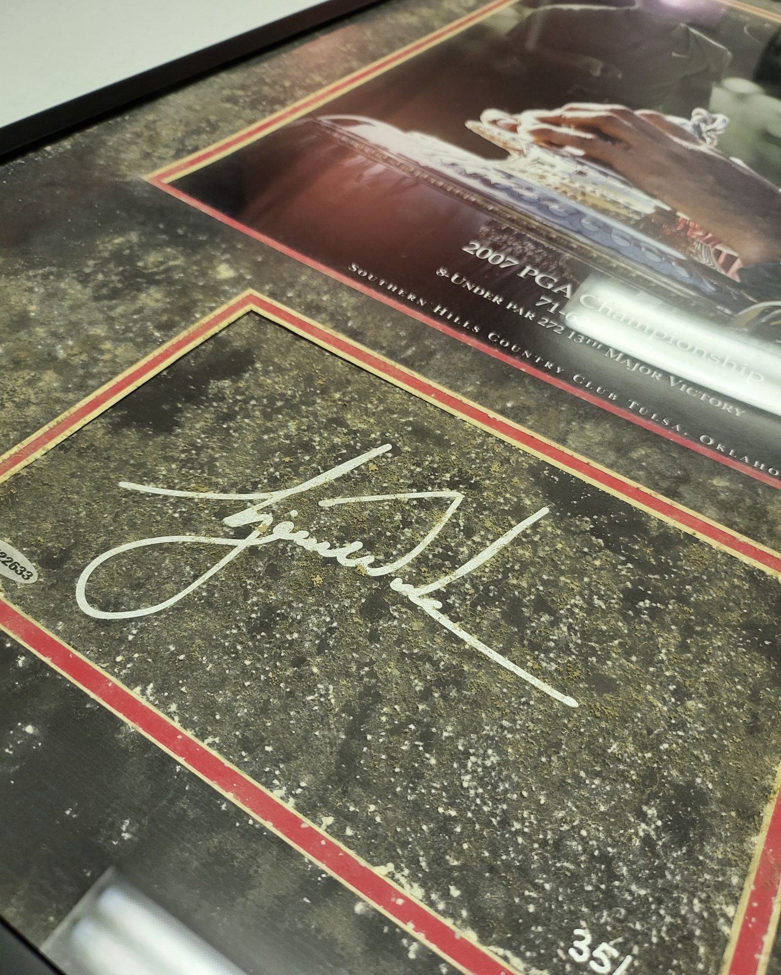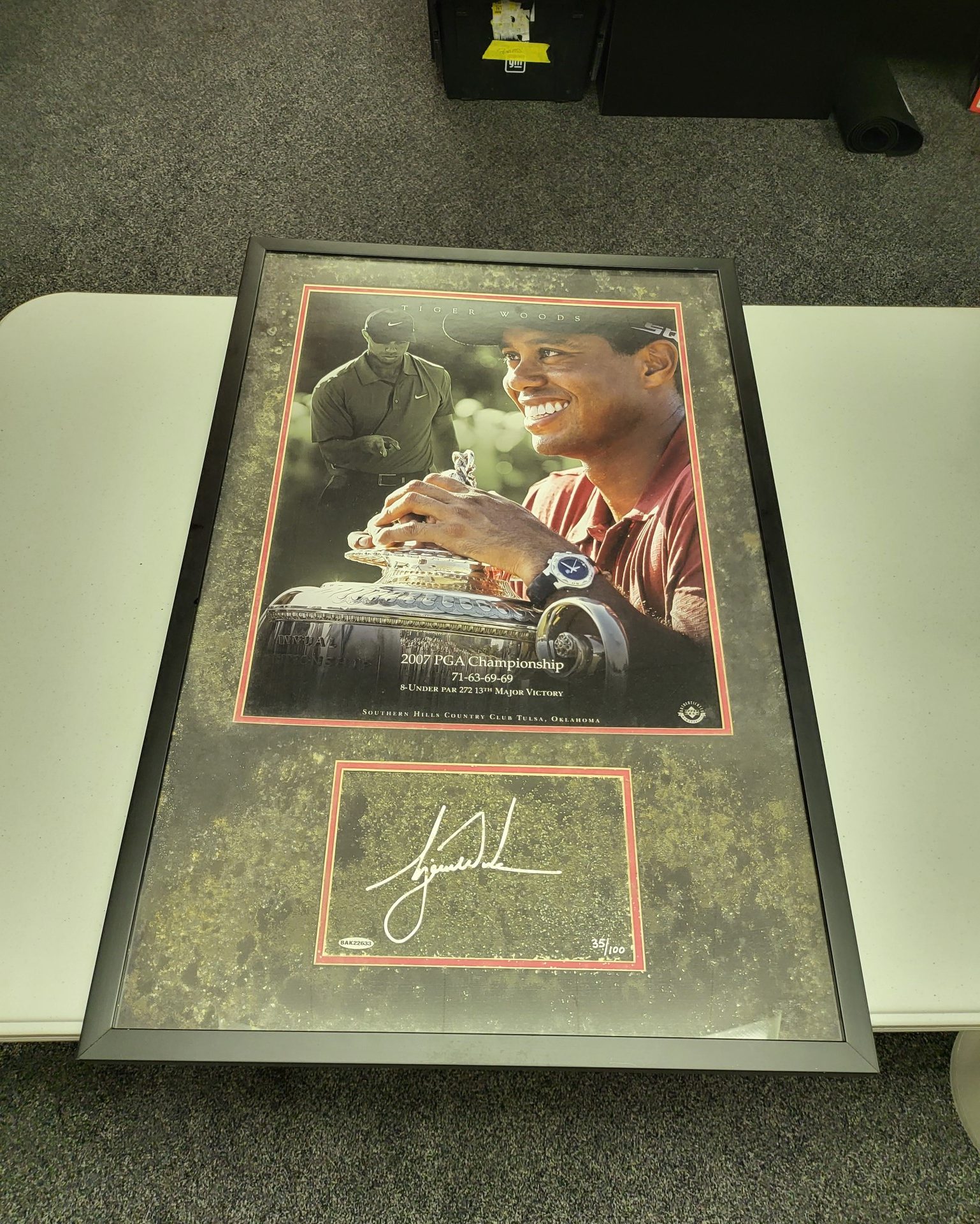 This black matte is autographed by Tiger Woods. The signed matte is framed with a 16″x20″ image from Tiger’s victory at the 2007 PGA Championship. Comes with Letter of Authenticity from Upper Deck.